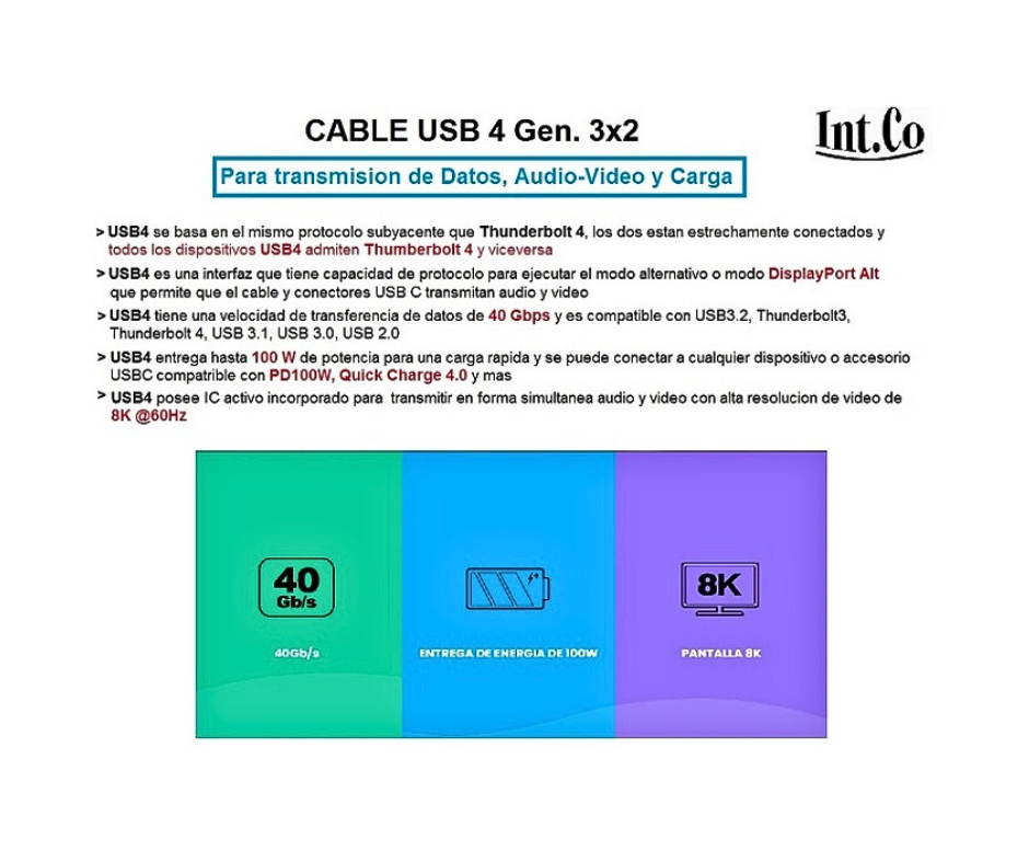 - Cable Tipo C USB4 4.0 Gen 3x2 compatible con Thunderbolt 3 y 4