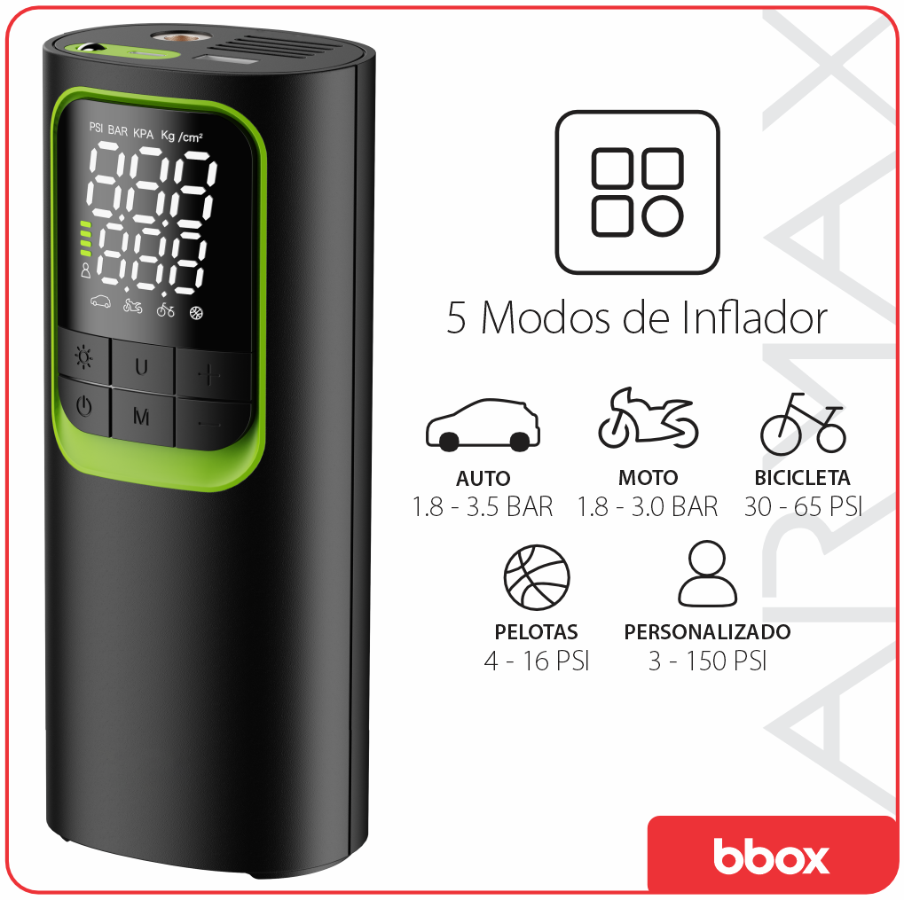 Tiene 5 modos de inflado. Para tu automóvil, moto, bici, pelotas y un modo personalizado.